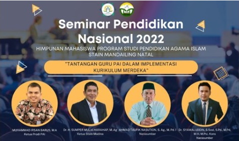 Berita 30 Oktober 2022 16 KaliPanyabungan – 30 Oktober 2022. HMPS Prodi PAI STAIN Madina sukses menggelar Seminar Nasional dengan tema Impelementasi Kurikulum Merdeka. Kegiatan tersebut digelar Aula Gedung Baru dengan menghadirkan Dr. Syawaluddin, M.Pd., dan Ahmad Taufik Nasution, S.Ag., M.Pd.I (28/10/2022). Pada